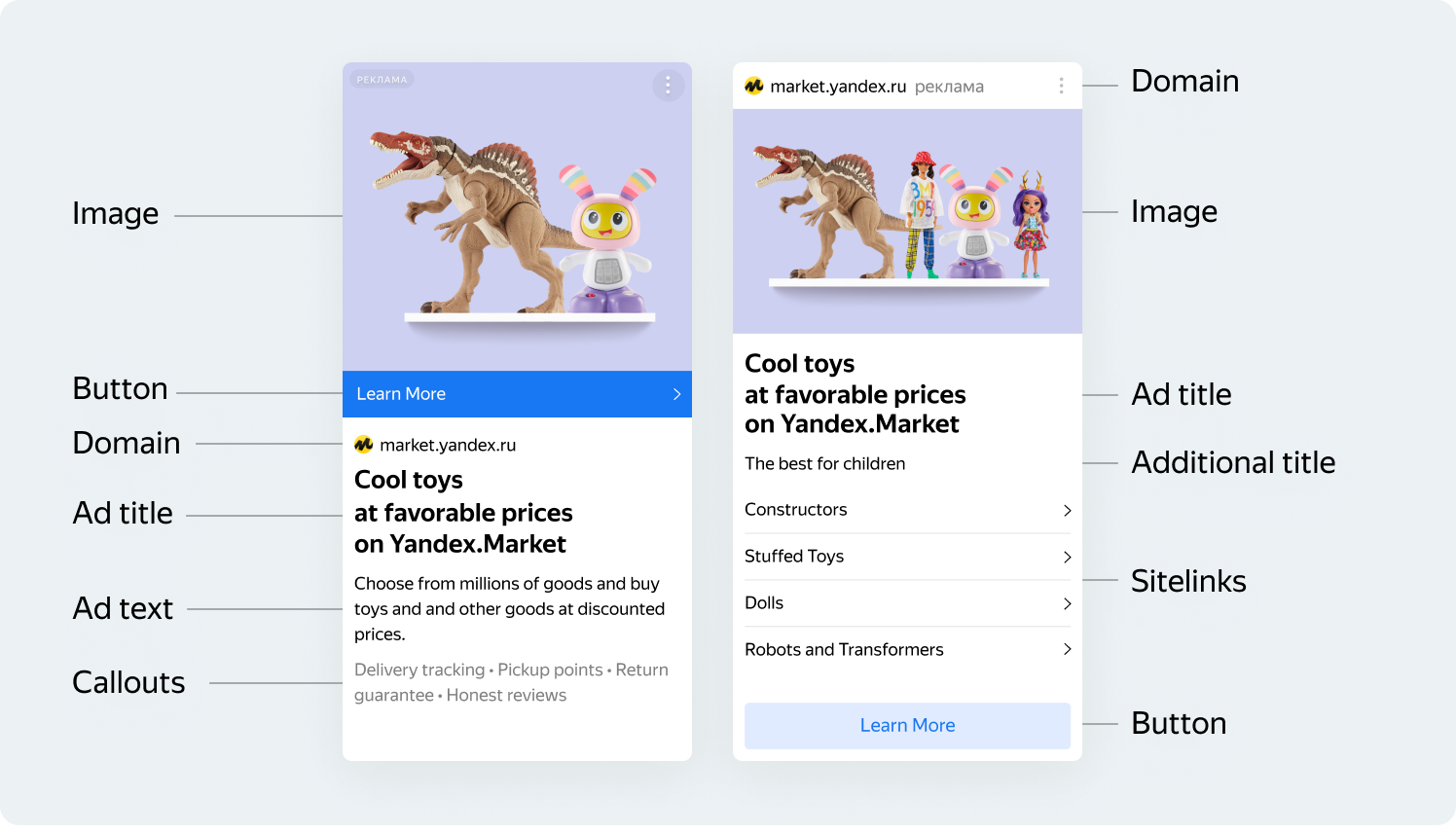 To make your ads more effective, we recommend that you fill out all the available fields when creating or editing your ad. In this case, the system will be able to create more options relevant for different users and situations. For example, you can add an image, a text, and sitelinks to suit people who prefer to reflect on ads before clicking them.