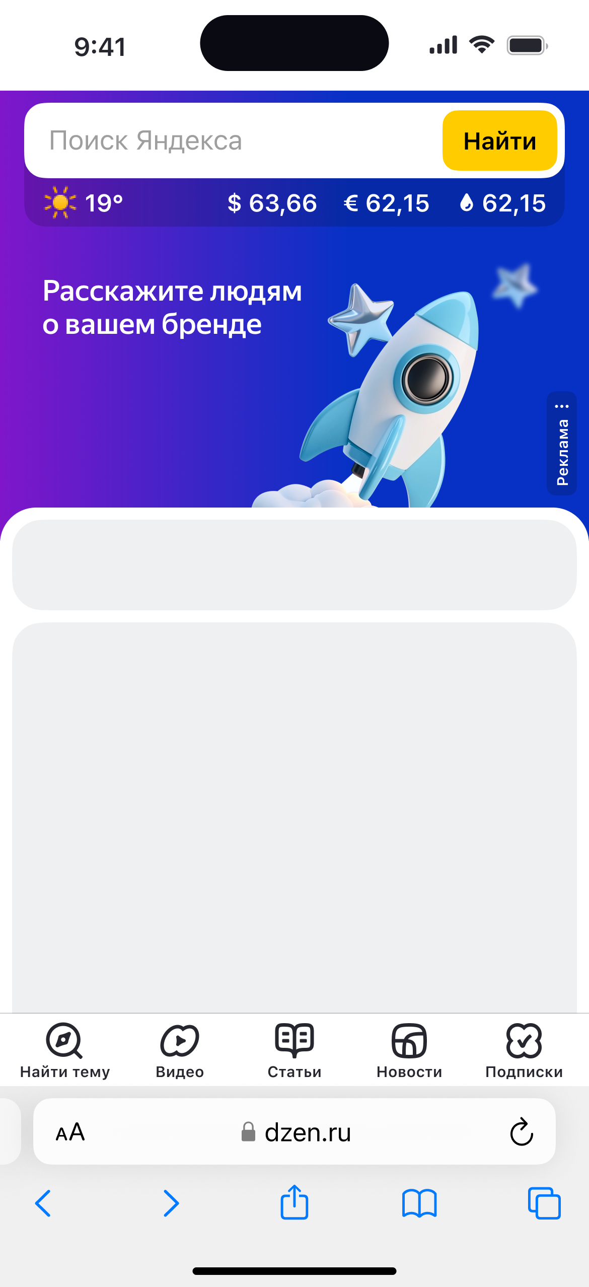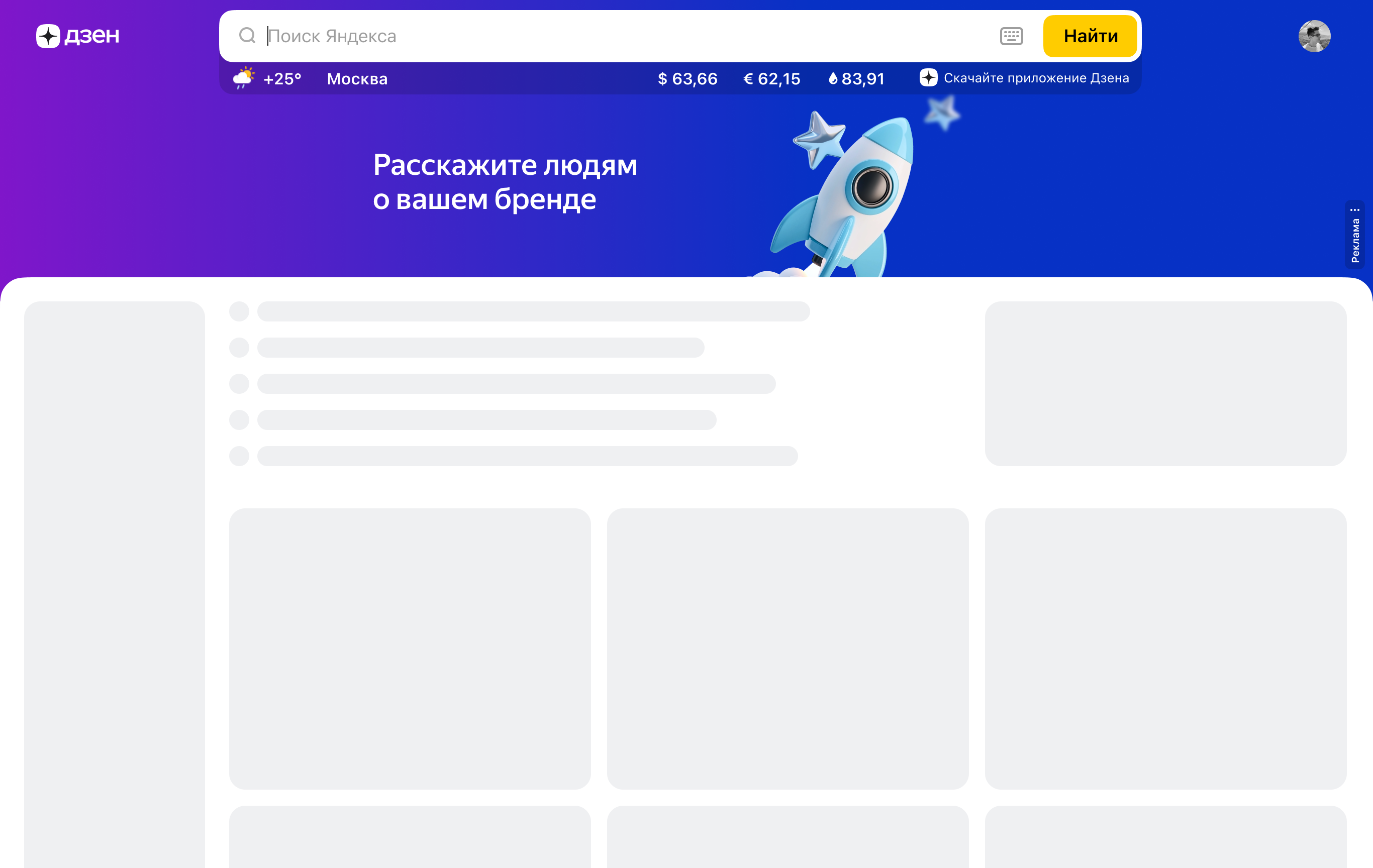 Dzen.ru is a content platform used by millions of people. This display format is positioned at the top of the portal (around the search bar) on both mobile and desktop versions, helping capture the attention of the platform's audience.