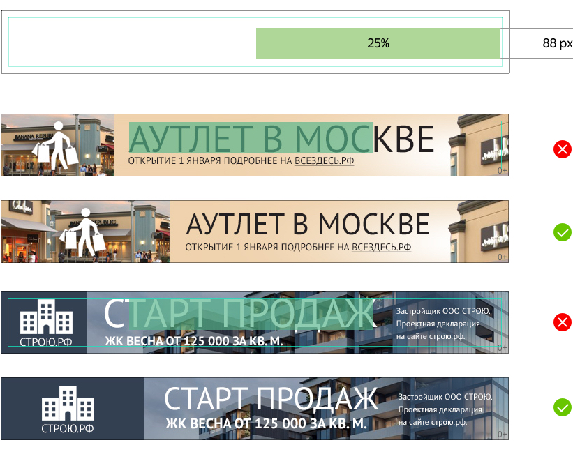 The margin between the edge of the banner and the text must be at least 20 pixels. Text and other banner elements can't overlap the safe areas.