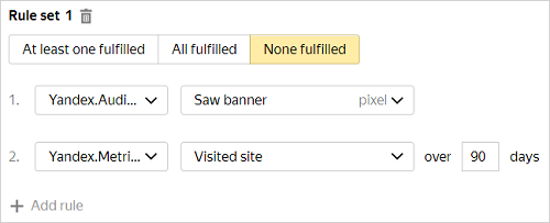 Create a segment based on a pixel in Yandex Audience. Specify the period to use for the data, and how many times the user must see the ad during the selected period.