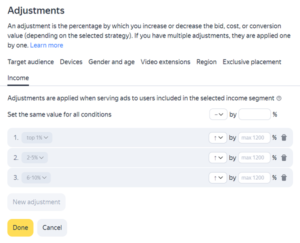 You can set adjustments for bids, CPC, or CPA for a high-income audience segment. The system analyzes different parameters of user behavior and assigns them to different segments reflecting their income level. The adjustments let you increase or decrease your bid, CPC, or CPA on impressions for 10% of high-income Yandex audience split into three groups:
