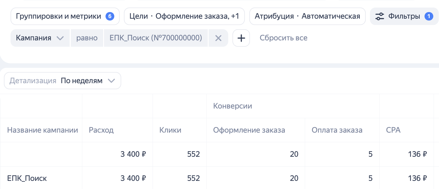 For example, a campaign delivers 20 conversions for the "Order placed" goal at an average CPA of ₽100, and 5 conversions for the "Order paid" goal at an average CPA of ₽300.
