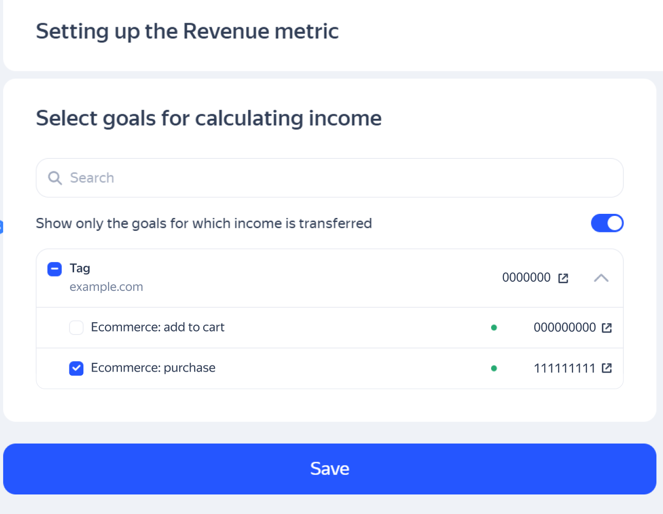 Click Save. If you don't manually save your list, Yandex Direct might automatically adjust it for revenue calculations. For example, if you set up a new goal for which you send revenue data, Yandex Direct will automatically update your list of goals.