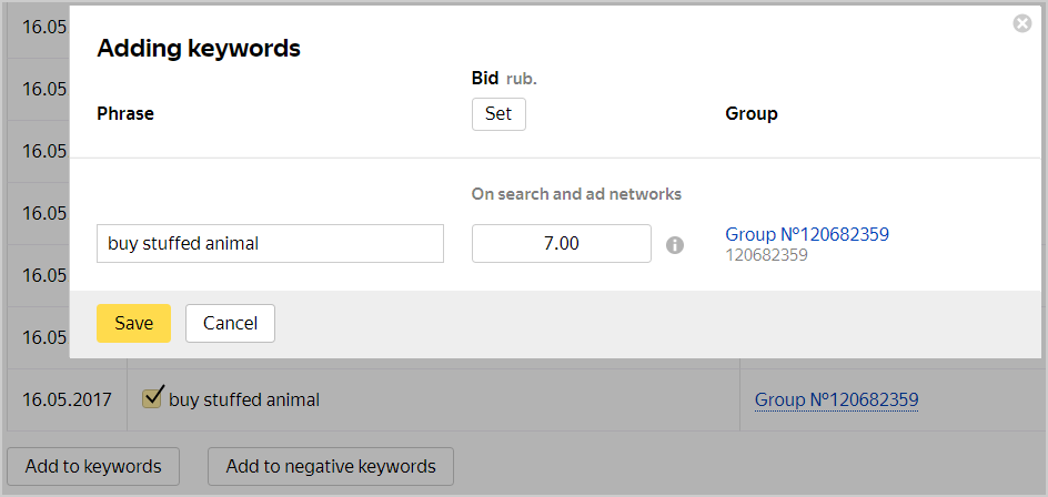 In the Adding keywords window that opens, edit the keywords (if required) with the use of operators, set the bid for the selected keyword or set a common price, then click Save.