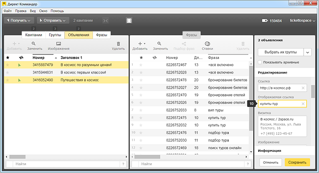 • копировать и перемещать кампании, группы, объявления и фразы;