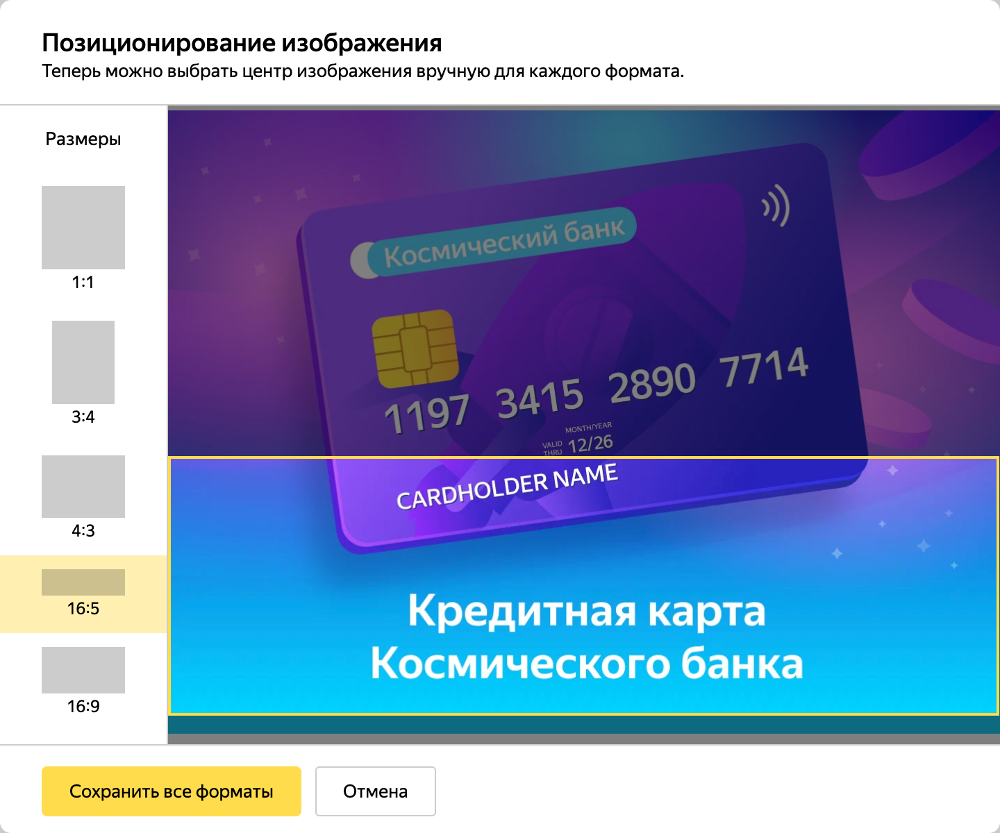 В Директе вы можете настроить для каждого формата изображения смарт-центр — главную по смыслу область, которая не будет потеряна при автоматической обрезке.