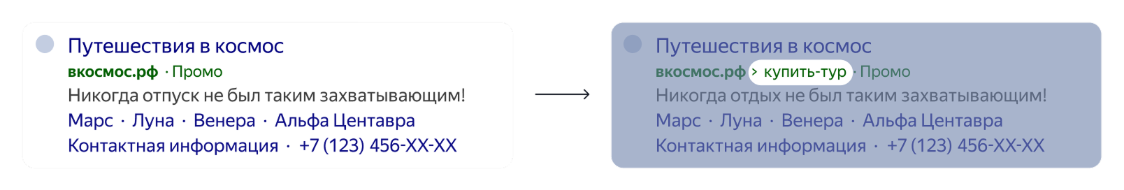 Отображаемая ссылка показывается в результатах поиска Яндекса. Некоторые форматы блоков Рекламной сети Яндекса также включают в себя отображаемую ссылку, если она помещается в блок.