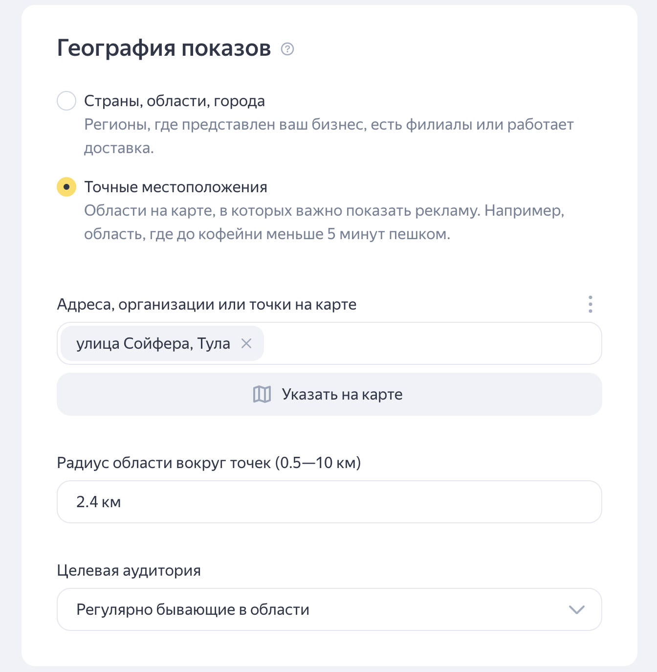 Введите адреса в свободной форме или скопируйте список из другой группы — 100 штук максимум. Адреса также можно указать на карте. Определите радиус показа — от 0,5 км до 10 км около каждого адреса.
