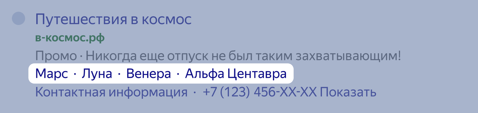 Вы можете добавить к объявлению до восьми быстрых ссылок, ведущих на страницы вашего сайта, страницу товара или услуги на Яндекс Маркете или в социальных сетях. Быстрые ссылки показываются как на поиске, так и в сетях (РСЯ и внешние сети). Количество отображаемых быстрых ссылок на разных площадках и устройствах может различаться. Максимальное количество быстрых ссылок показывается в объявлениях в эксклюзивном формате на поиске.