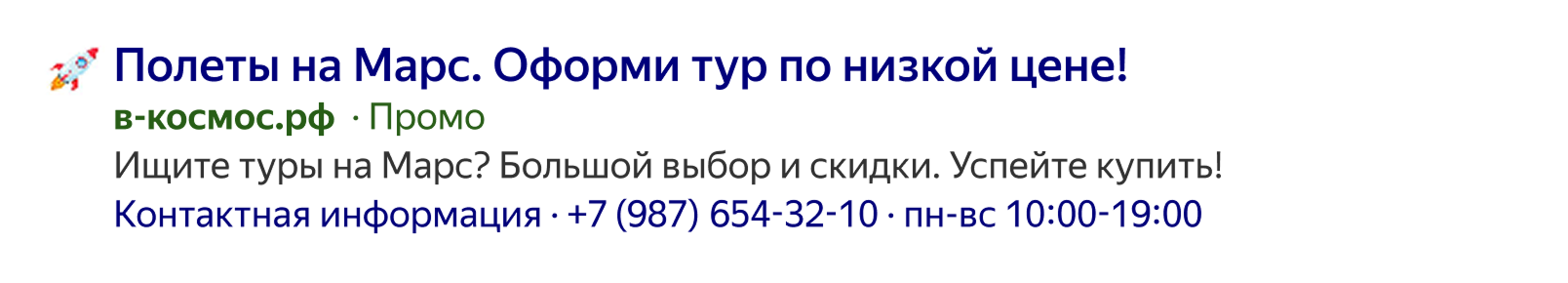 Расскажите пользователю, почему стоит выбрать именно ваше предложение. Укажите конкурентные преимущества: скидки, акции, условия доставки, гарантию и т. д. Стоимость товара или услуги обозначит ценовой сегмент и исключит нецелевые клики. Название фирмы привлечет внимание, если бренд известный и узнаваемый. Важно, чтобы информация в объявлении была достоверной и подтверждалась на сайте. Если пользователь не сможет сразу найти то, о чем шла речь в объявлении, он уйдет с сайта.