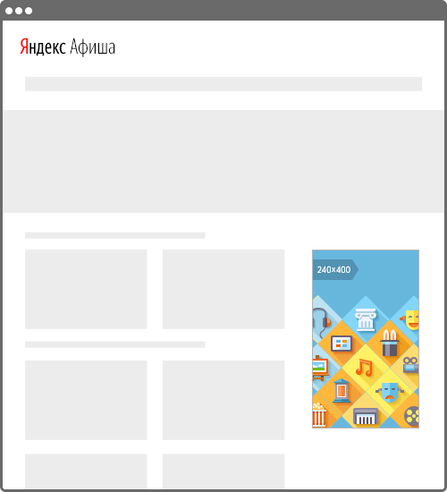 Размещение баннеров на Яндекс Афише входит в единое пакетное размещение рекламы в Медиасервисах. Баннеры на этих площадках охватывают большую аудиторию с широким кругом интересов.