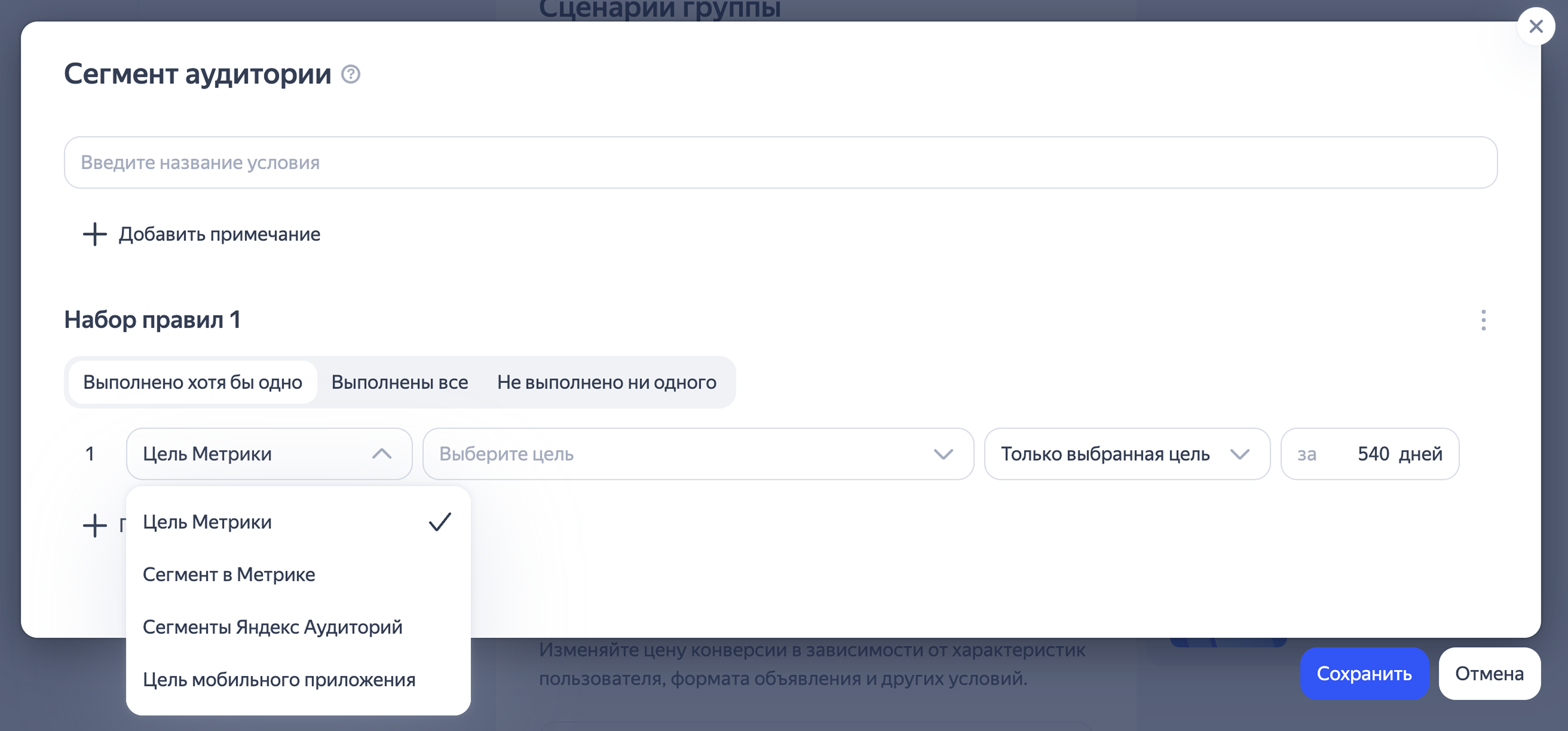 Если вы продвигаете интернет-магазин и у вас настроены цели для офлайн-конверсий, то в автоматически созданный сегмент уже добавлено условие о достижении цели "CRM: Заказ создан", его можно отредактировать.