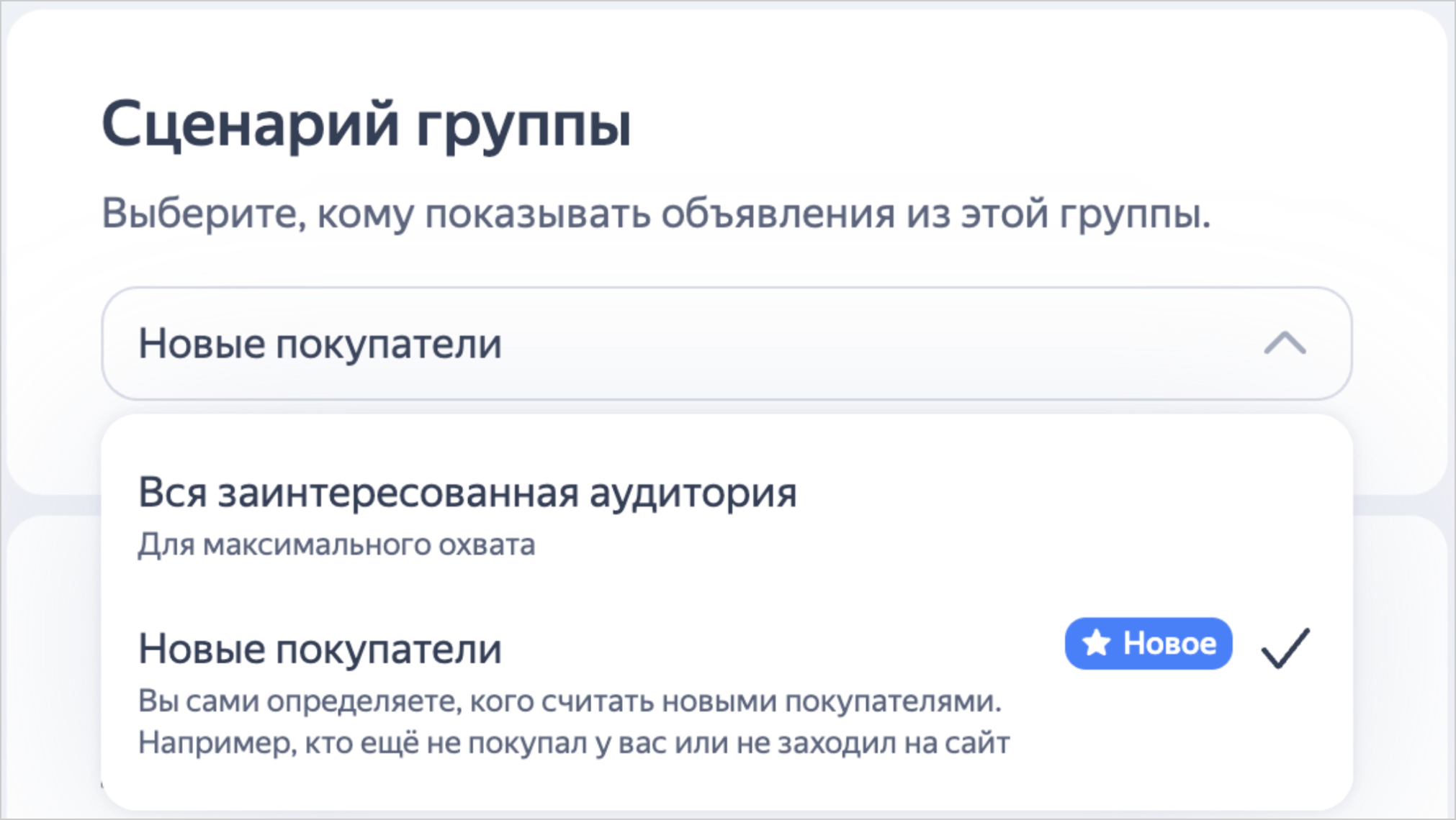 - Новые покупатели (для интернет-магазинов) или Новая аудитория (для других бизнесов) — кампания будет таргетироваться на пользователей, которые никогда ничего не покупали или не совершали других целевых действий на вашем сайте. Так вы сможете привлекать только новых клиентов.