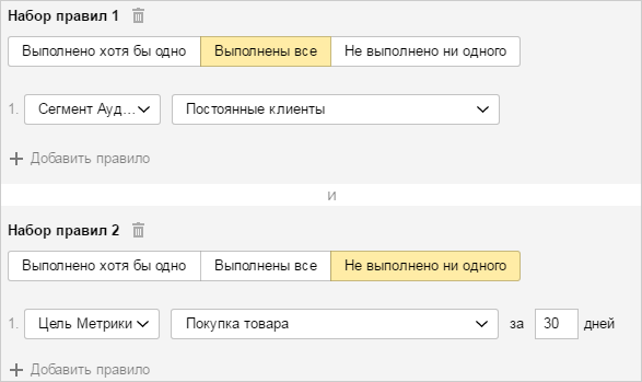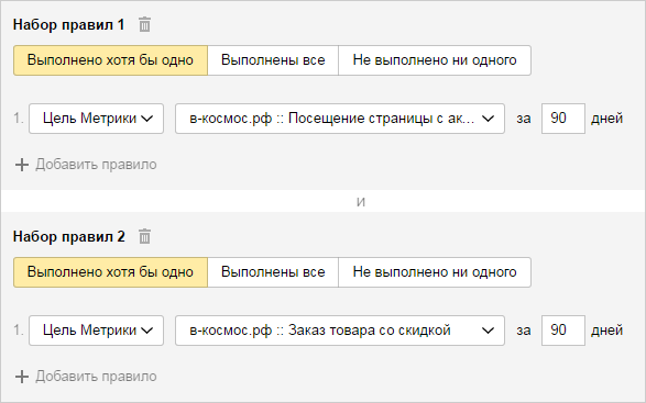 Условие формирования сегмента аудитории может состоять из одного или нескольких наборов правил (не более 50), объединенных оператором «И».
