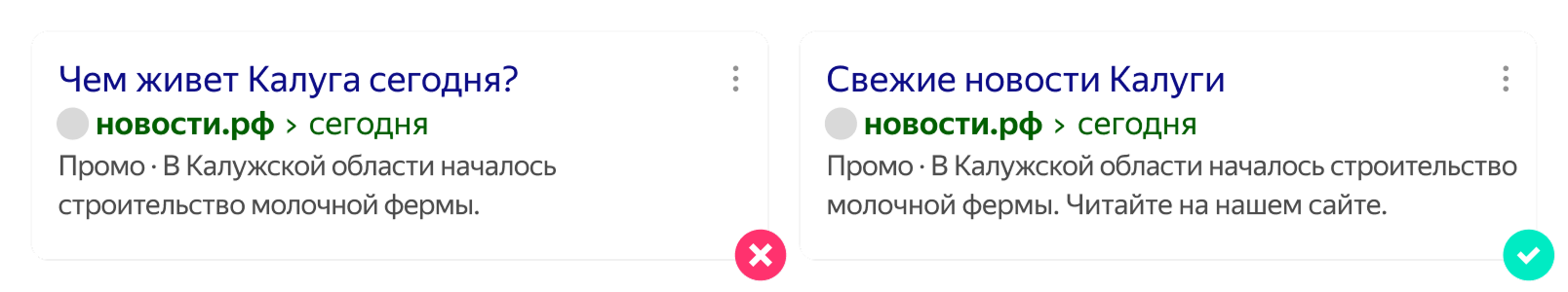 При продвижении новостных ресурсов в тексте объявления должно быть явно указано, что продвигается информационный ресурс или статья. Для этого используйте фразы со словами читайте, подробности, статья и другие. Текст объявления должен соответствовать заголовкам и содержанию новости, содержать указание на статью или источник новости и вести на страницу с полной версией статьи.