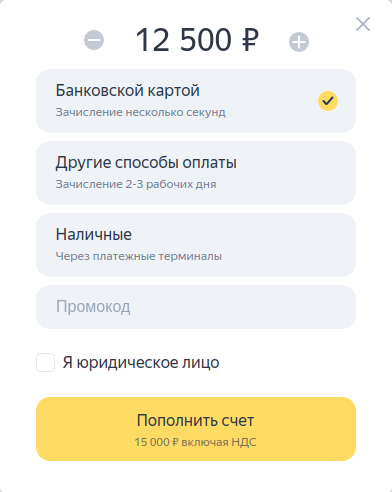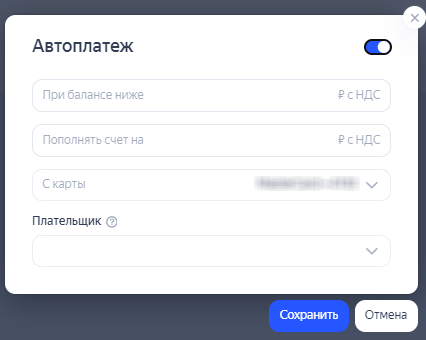 Автоплатеж на общий счет гарантирует бесперебойную работу продвижения: счет будет пополнен автоматически, как только остаток на нем достигнет заданного вами значения.