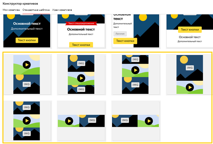 Откроется окно конструктора креативов. На вкладке Стандартные шаблоны выберите один из вариантов.