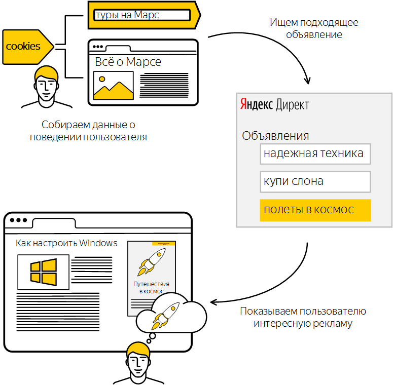 В Рекламной сети Яндекса и внешних сетях возможен показ объявлений с учетом интересов пользователей — поведенческий таргетинг. Анализируя поведение пользователя в интернете, в частности его поисковые запросы, Яндекс подбирает актуальные для него предложения. Интересы разделяются на краткосрочные и долгосрочные: если предпочтения пользователя изменились — тематика предложений также меняется.
