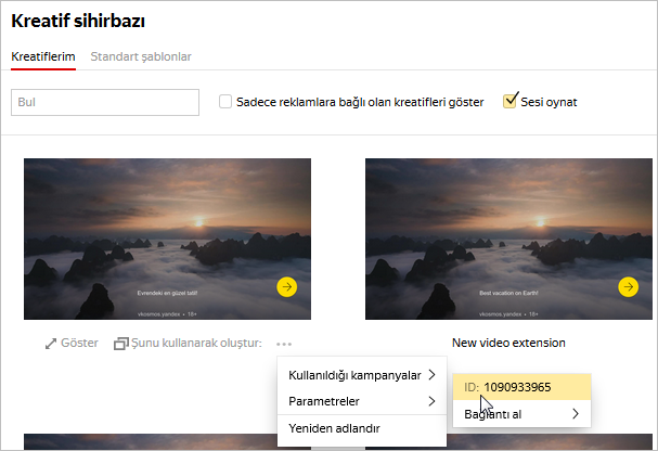 Reklam düzenleme sayfasında Video blokunda videonun altında video ID’si belirtilmiştir.