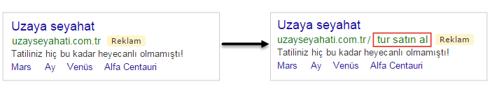Görüntülenen bağlantı, reklam oluşturulurken veya düzenlenirken eklenebilir. Görüntülenen bağlantı alanı, site bağlantısı eklendikten sonra otomatik olarak görünecektir. Bu alanda, örneğin ürün adı veya kullanıcı isteği belirtilebilir. Alan adını belirtmenize gerek yok. Görüntülenen bağlantının uzunluğu 20 karakteri geçmemelidir (alan adı hariç).