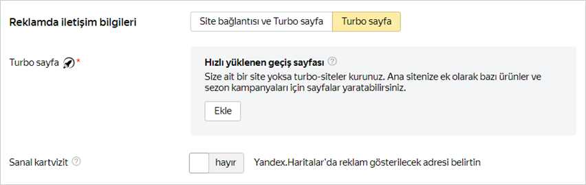 Reklam oluştururken veya düzenlerken, Turbo site ana site bağlantısına, hızlı bağlantıya, sanal kartvizite eklenebilir veya sadece Turbo site kullanılabilir. Farklı cihazlarda reklamın nereye yönlendirme yapacağı buna bağlıdır.