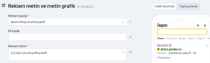Reklam oluştururken veya düzenlenirken şablon eklenebilir. Bunun için anahtar sözcük gruplarını ekleyeceğiniz yerleri sağdan ve soldan «#» simgesiyle sınırlandırılmalıdır: