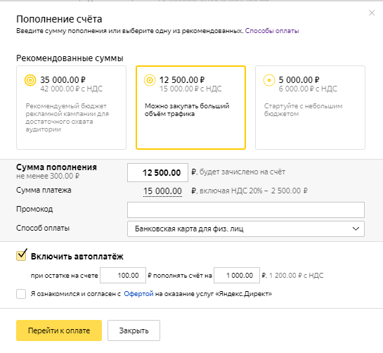 Hesaba para yükleme sayfasında reklam kampanyası bütçesinin miktarını girin. Miktar (KDV hariç), kampanya koşullarında belirtilen miktardan az olmamalıdır.
