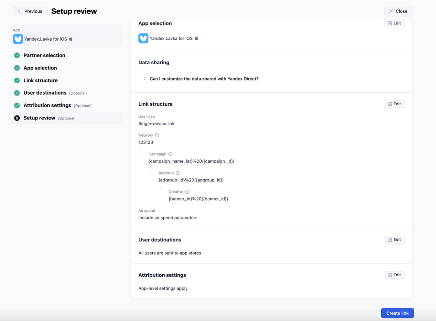 Yandex Direct, şu izleme sistemlerini destekler: AppMetrica, AppsFlyer, Adjust, Branch, Kochava, MyTracker, Singular, Tenjin ve AirBridge. iOS 14.5 kampanyası için SKAdNetwork desteği AppMetrica, AppsFlyer ve Adjust sistemlerinde çalışır.