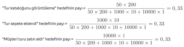 “Müşteri turu satın aldı” hedefine ulaşılması işletmeye 10.000 TL kazandırır. Bu, işletme için bir dönüşümün değeridir. Sepete tur ekleyen her onuncu müşteri daha sonra onu satın alıyor. “Tur sepete eklendi” dönüşümün değeri = 10 000 / 10 = 1 000 (TL), dönüşüm adeti = 10 000 / 1000 = 10. Kataloğu görüntüleyen her yirminci müşteri sepete tur ekliyor. “Tur kataloğunu görüntüleme” dönüşüm değeri = 1.000 / 20 = 50 (lira), dönüşüm sayısı = 10.000 / 50 = 200.