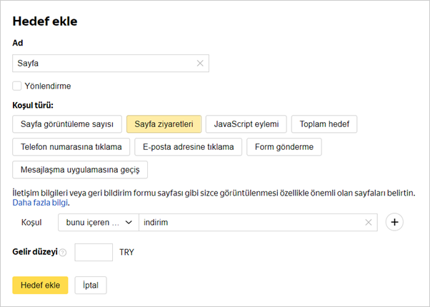 Yandex Metrica Yardım’da hedefler hakkında daha fazla bilgi edinebilirsiniz.