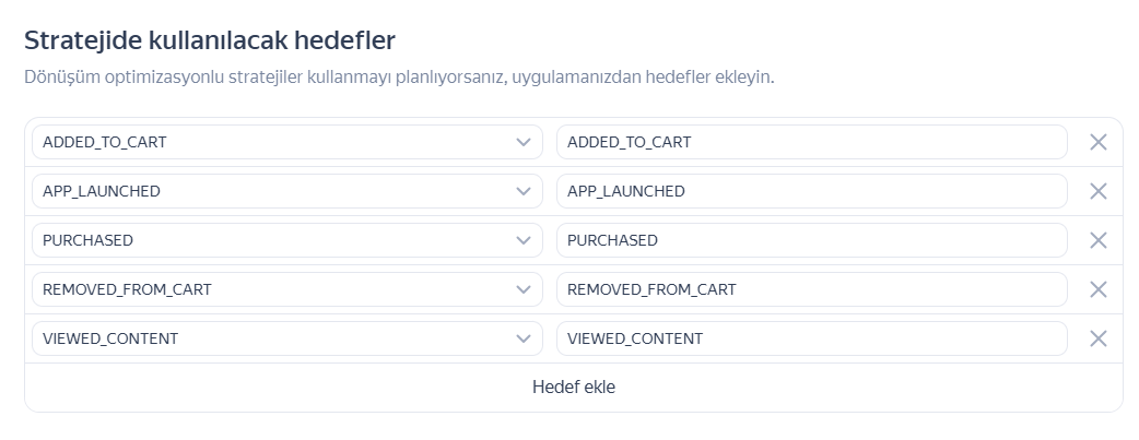 Stratejide kullanılacak hedefler blokunda gerekli olanları ekleyin. Optimizasyonda kullandığınız, sitedeki olaylara eş değer hedefleri kullanmak daha iyidir. Örneğin, BKP’de uygulamadaki kullanıcıların gösterilmeye başlanması için üç zorunlu hedef ayarlayın: