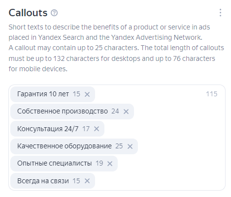 Yandex 建议保证宣传信息简洁明了。 一旦创建,您可以将宣传信息添加到一个或多个广告系列的所有广告中。