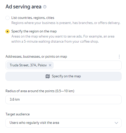 如果您想要在特定位置(例如咖啡馆附近)投放广告,或者需要定向小区域内的客户,请在地图上指定地区。 例如,您有一家不提供全市配送服务的小型企业。 此外,如果地区选择树中缺少您所在的位置,我们建议选择Specify the region on the map。 请记住,在地图上选择地区可能会极大地限制您的地理定向区域,并导致您错过潜在客户。