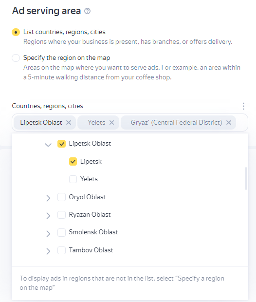 您可以排除此字段中列出的任何地区。 它不必是指定展示地区的一部分。 例如,您可以选择在利佩茨克州(叶列茨市和格里亚济市除外)投放广告。