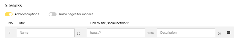 最多可以在广告中添加八个快速链接。 这些链接指向宣传网站页面、Yandex Market 或社交媒体上的产品或服务页面。 快速链接会显示到 Yandex 搜索结果页面和广告网络联盟(YAN 和合作伙伴平台)中。 展示的快速链接数量可能因网站和设备而异。 快速链接的最大数量显示在搜索结果的扩展式广告形式中。