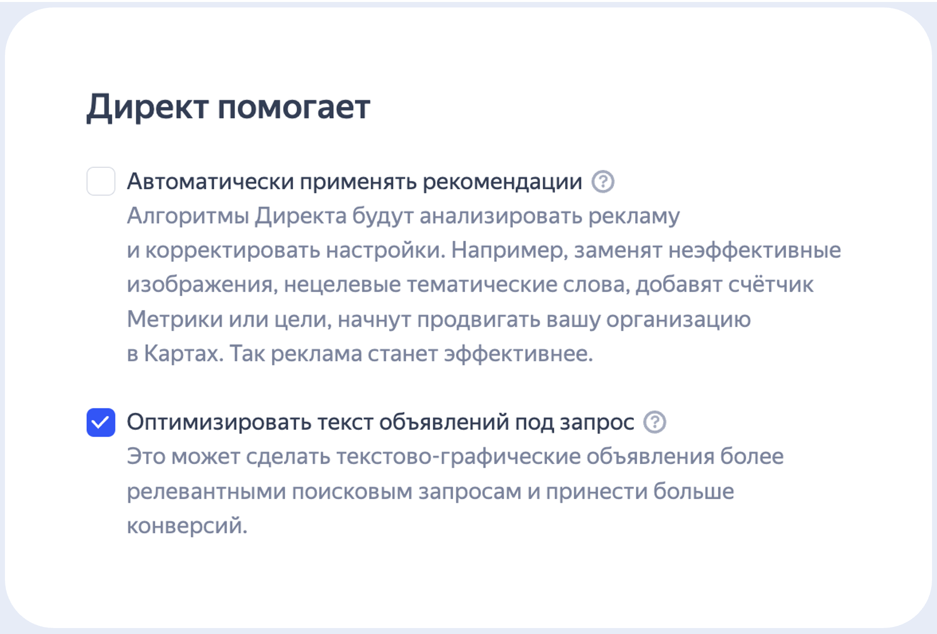 启用或禁用页面底部 Yandex Direct helps 下的 Optimize ad text for queries 选项。