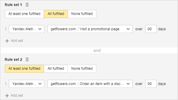例如,如果在 Yandex Metrica 中创建了一个用户细分,其中包含 “Visit a promotional page” 和 “Order a discounted item” 两个完成目标,则样本将仅包括在同一会话中既访问了促销活动页面,又订购了折扣商品的用户。