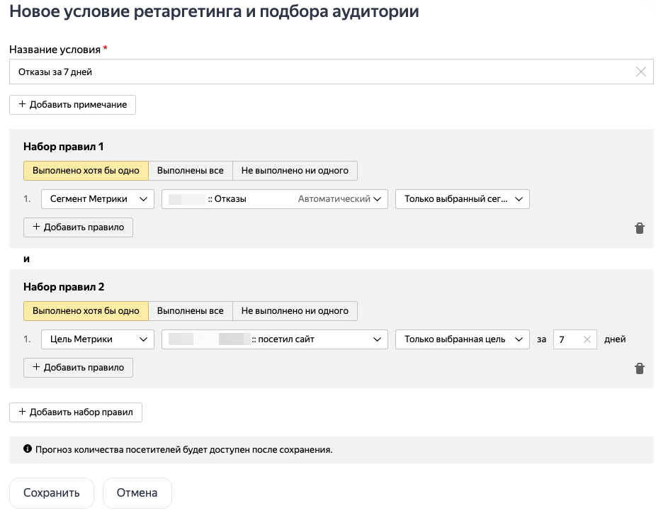 根据 Yandex Audience 用户细分、Yandex Metrica 目标或 Yandex Metrica 用户细分创建规则(您可以使用任何包含 100 名或更多用户的自动或自定义用户细分)。