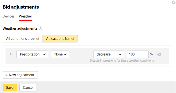 添加出价调整到“其他”广告组。 在 Weather 标签中选择出价调整条件时,点击 All fulfilled。 如果有降雨和云,则将出价降低 100%。 在这些情况下,不投放广告。