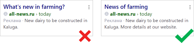不要使用没有指定您所宣传的产品或服务的通用关键字(例如,购买、公寓_或_折扣)。 使用与您的广告主题直接关联的关键词代替它们:购买折扣汽车座椅、_购买莫斯科市中心的公寓_等等。