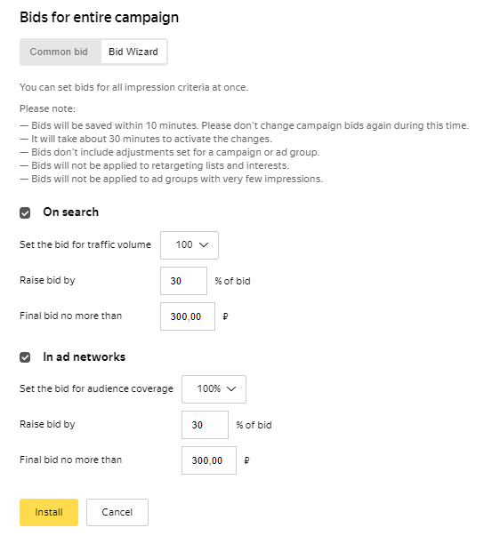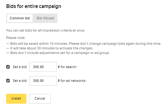 Yandex 网盟中的出价只可以自动设置。