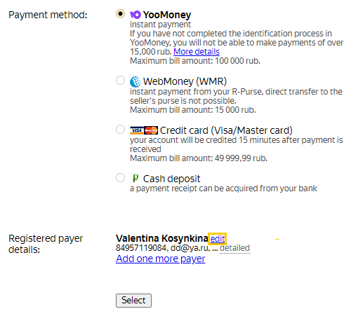 如果在对共享账户充值时想更改付款方式,请转到 Issue an invoice 页面,然后在检查数据时点击 change payment method or payer 以转到 Select account payment method 页面。 选择付款方式。