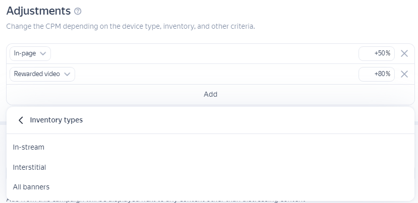 视频广告中,您可以为特定类型的库存设置调整。 通过调整,您可以增加或减少广告的每千次展示成本或每次访问成本: