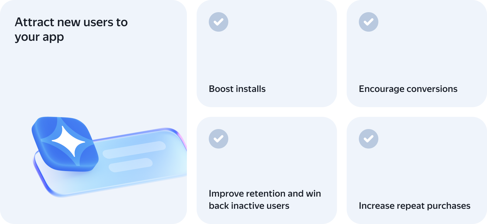 移动应用广告是 Yandex Direct 的一个工具,可用于推广您的 iOS 或 Android 应用程序。 开发者和广告投放平台可以使用这个工具来吸引新用户,或挽回长时间没有登录应用的用户。