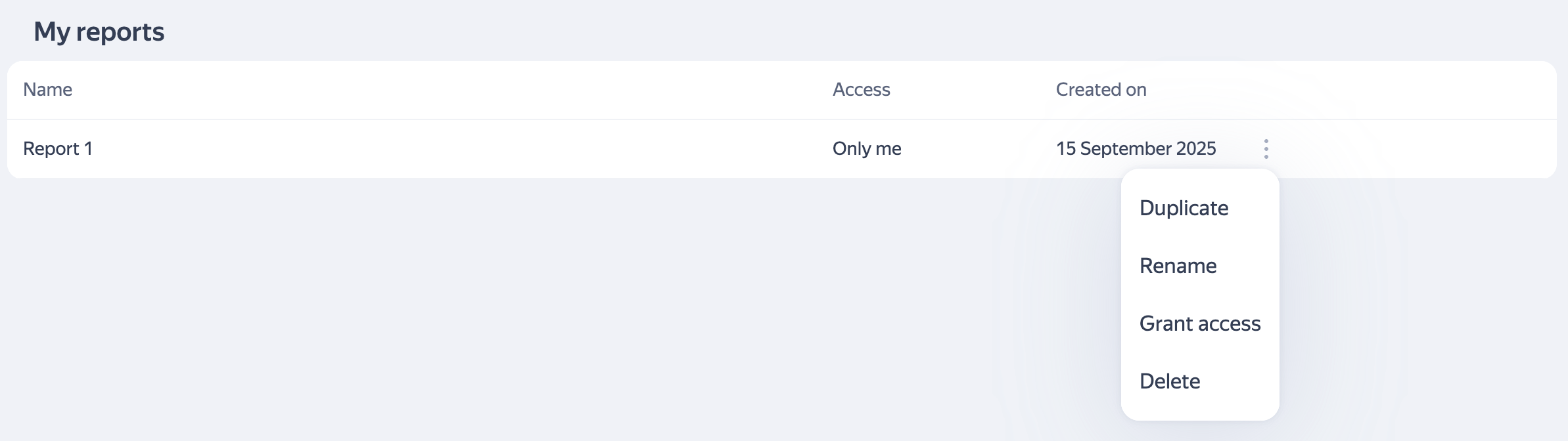 要查看和编辑已保存的报表,请前往左侧菜单并选择Statistics→ My reports。 如需复制、重命名或删除报表,请点击报表名称旁的