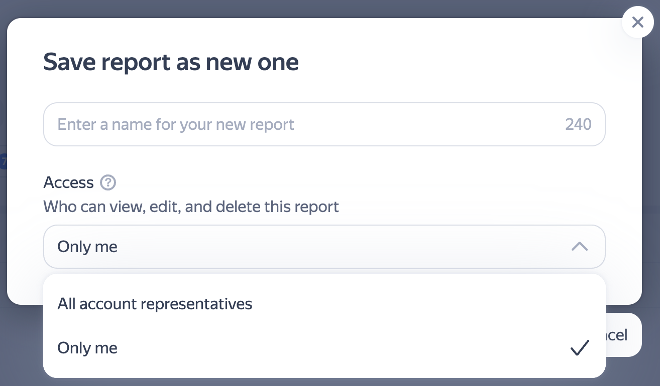 要保存您的报表,请点击右上角的Save report→Save report as new one。 保存时,您可选择报表访问权限的授予对象,例如仅限本人或所有账户代表。