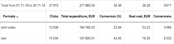 例如,通过添加 Formats 数据细分,您将看到带有视频的广告可带来更多的转化量,且这些转化的价格更低。 这样,通过设置投放带有视频的广告的出价调整,您可以获得额外的转化量。