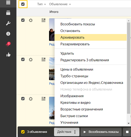若要对组内的所有广告应用操作,请在表头中启用选择所有广告的选项。 点击 Actions 并选择所需的操作。