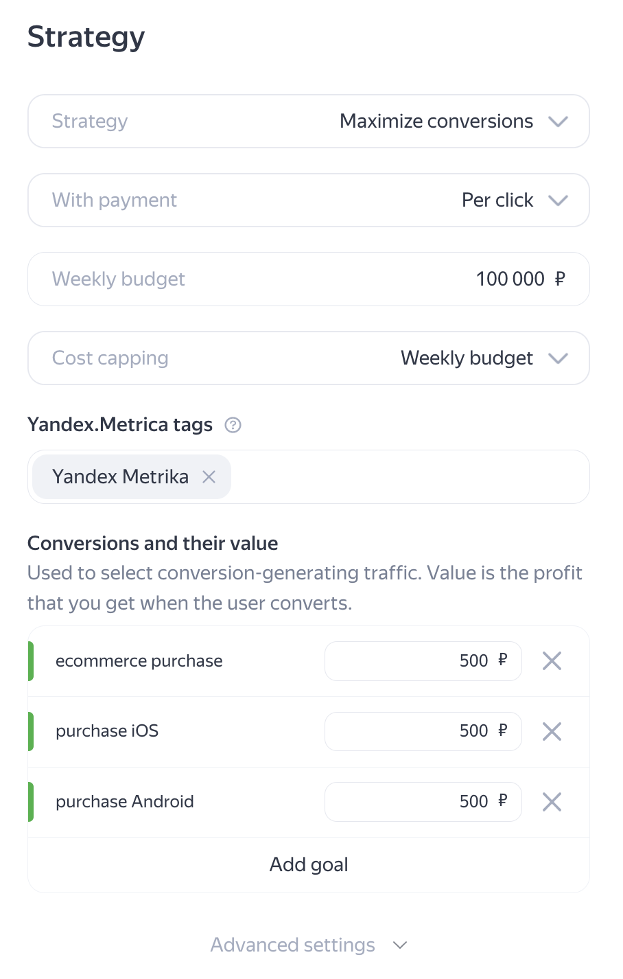 4. 设置动态目标值。 要根据应用内目标的广告支出比例指标优化广告系列,请设置事件收入的收集和发送至 Yandex Direct。