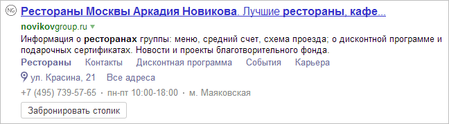 If the snippet information, including contact details, contradicts your site, make changes in Yandex Business or in Yandex Maps. For more information, see Yandex Business help.